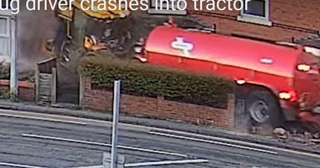 usage, drove into(rightway after})body),]$triggered by a red light. The vehicle collided with a JCB pulling a double axle agricultural tanker, leading to a vast destruction. The tractor and trailer plowed through a row of houses, damaging the exterior and leaving few belongings intact, such as those of Cumpsty and pet ownership.